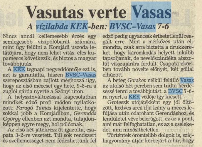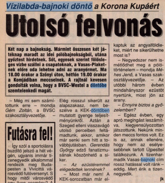 „Jó jelnek tartom, hogy a játékosokon semmiféle görcs nem látszik, szinte nem is beszélnek a mérkőzésről” – közölte trénerük, Gerendás György. „Úgy vannak vele, hogy bemennek, aztán lejátszanak egy meccset, nem számít, hogy ez a bajnoki döntő. Az már kevésbé tetszik, hogy Varga Tamás (a Vasas centere – a szerk.) visszafogottan nyilatkozott az esélyekről. A KEK-negyeddöntő előtt közölte: sajnálja, hogy egy magyar csapatot kell kiverniük a kupából. Most viszont azt mondta, nem örül a BVSC-nek. Kár, mert láthatólag nem kezelnek le bennünket. Mindegy, így is megpróbáljuk, bár szerintem összességében sem számít sokat, hogy előzőleg kétszer is mi voltunk a jobbak oda-vissza alapon. Hogy a két hosszabbításos továbbjutás után vannak-e még tartalékaink? A fiúknak biztos, nekem már kevésbé, ugyanis 20 ezer forintra büntetett a fegyelmi bizottság az UTE elleni óraborogatás miatt. Eddig összesen 45 ezremben van a fesztiválozás, ami tekintve, hogy 45 hónapja vagyok a BVSC edzője, nem is olyan rossz arány. A döntőn azonban kétszer is meggondolom, hogy nekikezdek-e, mert Faragó azt mondta, ha meglátja, hogy a Gerendásnak engedik, akkor ő is nekiül balhézni. Na most én ismerem játékoskorából, milyen az, ha Tonó balhézni kezd. Maradjunk annyiban, nem egy matyóhímzés. Szóval, el kell döntenem, jó-e az nekünk, ha ő is kiborul? Komolyra fordítva: számomra ez a siker lenne az edzői pályafutásom csúcsa, még tán verné az atlantai Világkupa-aranyat is, hiszen ott segítőként voltam jelen. Ez viszont az első olyan jelentős győzelem lehet, ahol én vagyok a cigányprímás.”