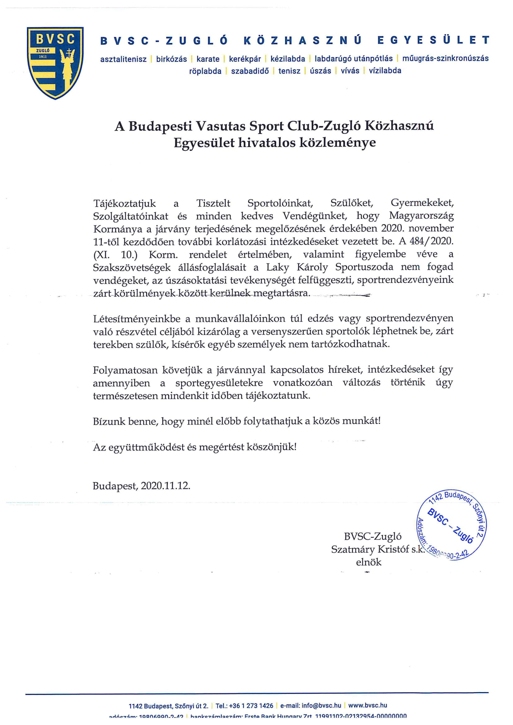 A BVSC-Zugló hivatalos közleménye az új járványügyi korlátozó intézkedésekkel kapcsolatban.