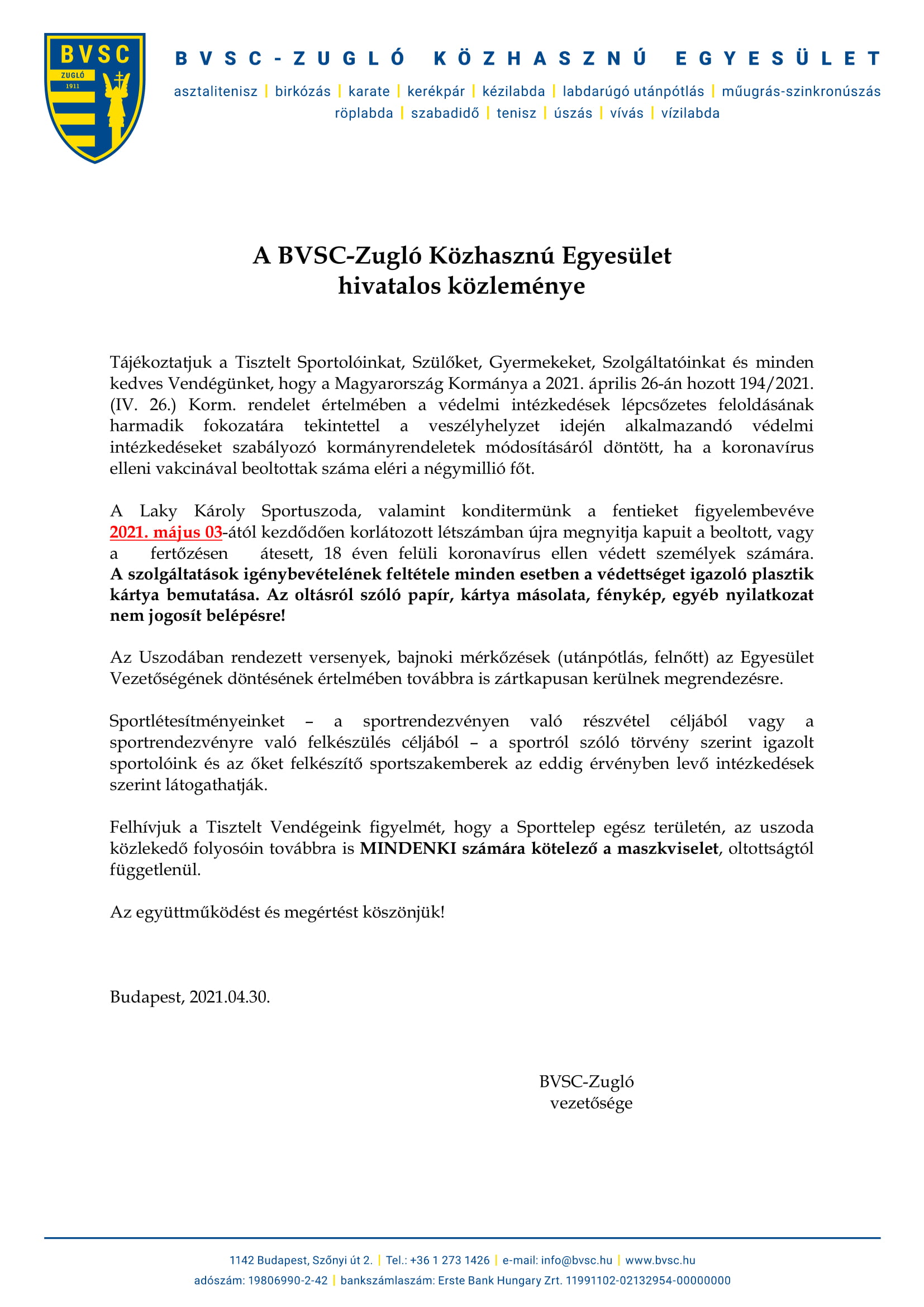 A BVSC-Zugló hivatalos közleménye a nyitással kapcsolatos intézkedésekről.