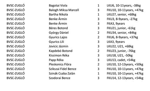 Az utánpótláskorú versenyzőink közül Bagotai Viola, Szinák Csaba Zalán aranyérmes, Kapdebo Botond, Gyurics Lajos, Pleskonics Flóra ezüstérmes lett, míg Kissimon Réka, Jovacic Jázmin, Balogh Miksa Marcell, Benke Ármin 2x, Szodorai Bence, Szikszai Fidel Bence, Papp Réka, Gyurics Lili és Béres Botond a dobogó harmadik fokára állhatott fel.