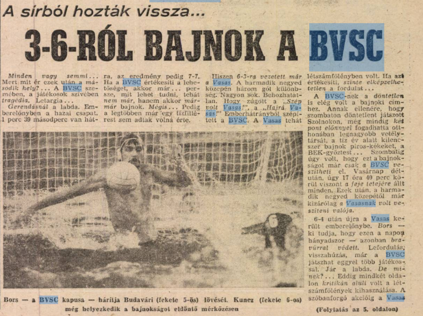 „Még mi sem számítottunk erre” – mondja Gém Zoltán, a BVSC szakosztályvezetője. „Elég rosszul sikerült az alapszakasz, nem beszélve a KEK-döntőben mutatott gyenge teljesítményünkről. Aztán a Szeged elleni visszavágó utolsó perceiben feltámadtunk, akkor, amikor már senki sem hitt a továbbjutásban. Gerendás György edző fanatizmusának köszönhető a siker.” – Az ezüstéremmel elégedettek lennének? – „Most már nem! A KEK-sorozatban már elkaptuk az angyalföldieket, miért ne sikerülhetne most is?”