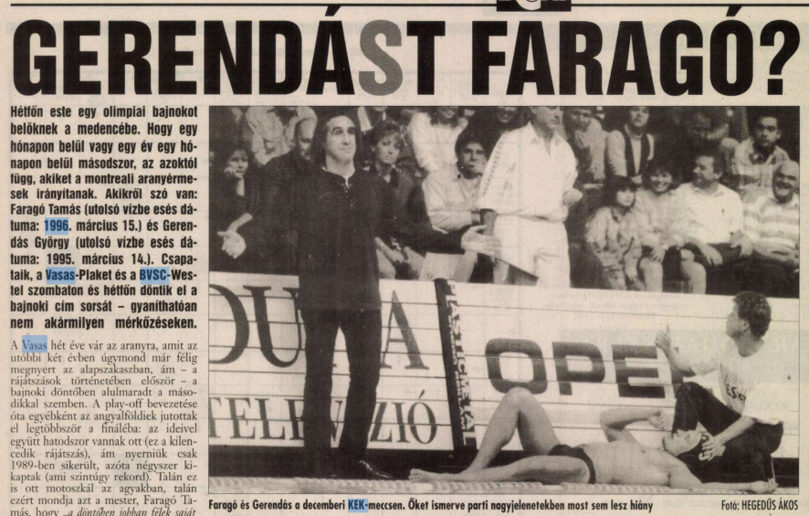 1995-96-ban, tehát Vasas-BVSC döntő volt a magyar vízilabda bajnokságban. Ehhez hasonló két meccses bajnoki fináléban nem volt még egymás ellen a két csapat, bár 1985-ben a sorsolás úgy hozta, hogy a Szőnyi úton az akkor még sátortetős Szőnyi úti uszoda népes nézőközönsége egy BVSC–Vasas találkozó után ünnepelhetett két évtized után, Vasutas bajnokavatást.