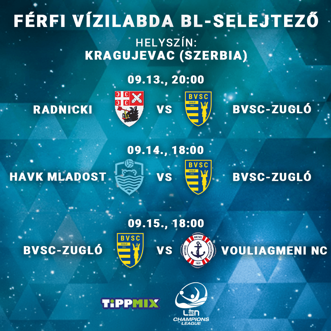 Miként arról korábban beszámoltunk, a két fél megegyezése értelmében az OSC helyett a BVSC mérettethet meg a Bajnokok Ligája kvalifikációs körében. Varga Dániel együttese a görög Vouliagmeni, a horvát HAVK Mladost és a szerb Radnicki gárdájával került egy kvartettbe. A B-jelű csoportkörnek szeptember 13. és 15. között Szerbia, Kragujevac ad otthont.